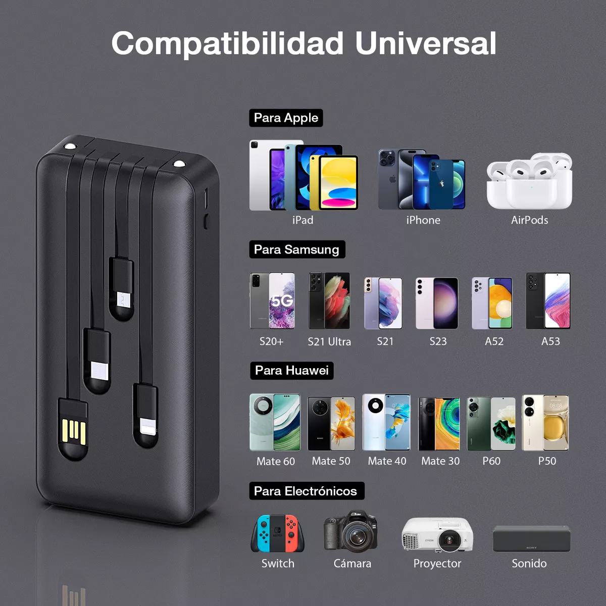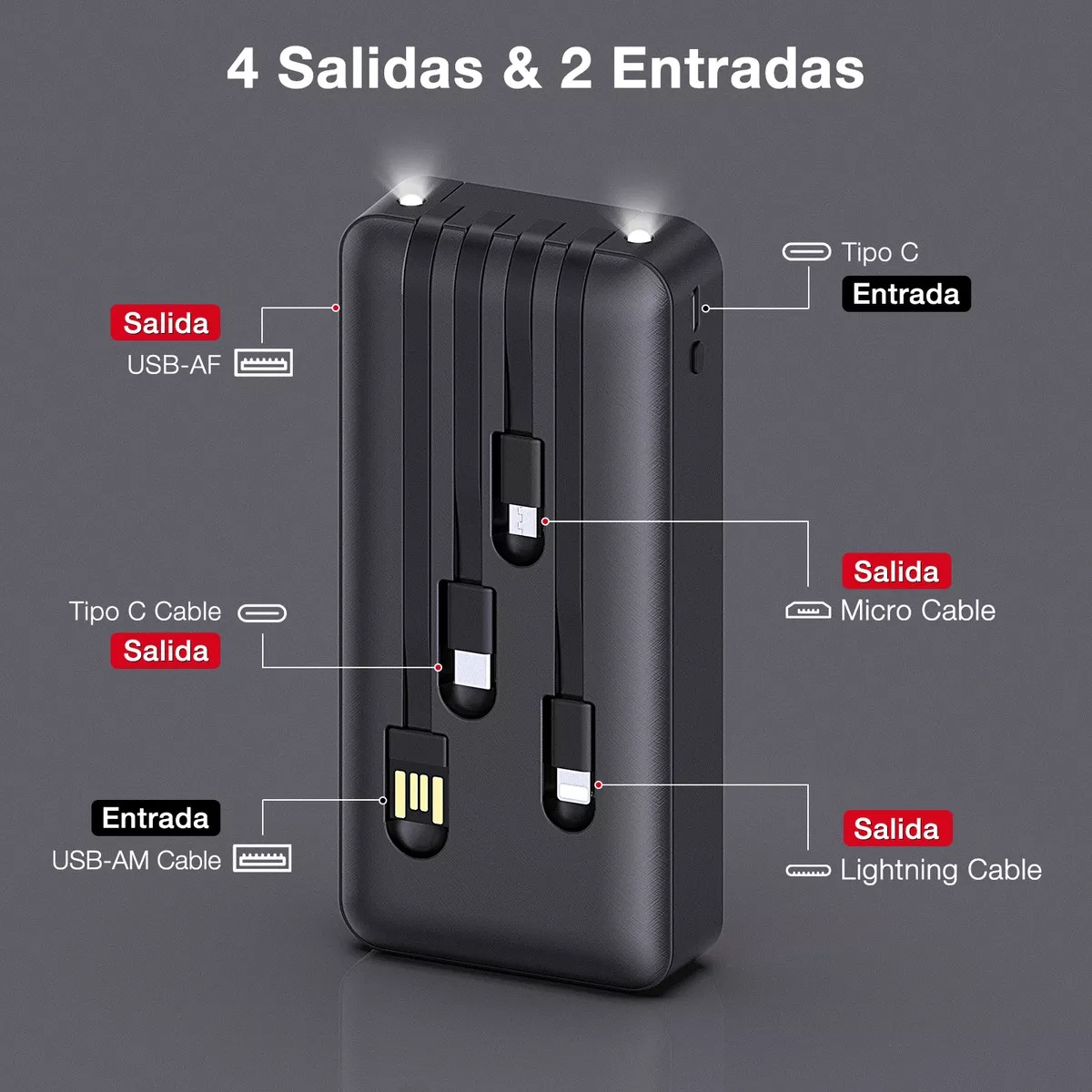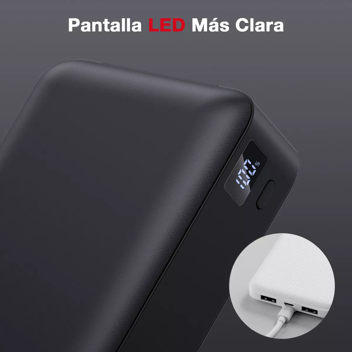 bateria portátil de 20000mAh 10.5W MAX cuenta con gran capacidad y carga eficiente. pantalla LED, compatibilidad con teléfonos, tabletas y aparatos electrónicos. linterna LED.